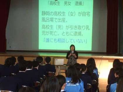 2月19日(金)の3校時に3年生対象の性教育講演会を行いました。講師は、独立行政法人 国立国際医療研究センター病院 国際感染症センター 看護師の堀成美さんをお招きしました。