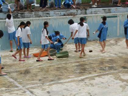 テストが終わり、第3校時は1年生全員とスクールボランティアの方によるプール清掃を行いました。プール入り口前に集合し、加藤先生の約束事項を聴いた後、スムーズに作業に入り、全員一生懸命取り組みました。これまで上級生に色々やってもらっていた1年生でしたが、今日は何かたくましさを感じました。これからどんどん成長していくことと思います。