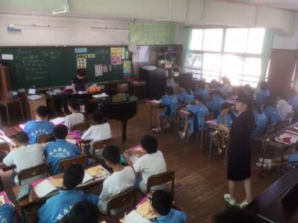 今日は学生1名でしたが、元気よく生徒と一緒に歌うなど積極的に音楽科の授業補助をしていました。また、今日の学生は、サクソフォーンが専門ということだったので、授業の後半に大森先生のピアノと学生のサックスのコラボで、「赤とんぼ」を演奏し、生徒はそれに合わせて4番まで歌いました。普段なかなか身近に見ることができない楽器の演奏を目の前で体感できた事は、生徒にとってとても素晴らしい経験になったと思います。