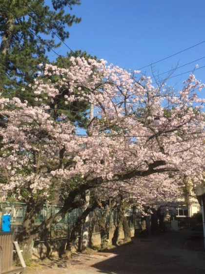 4月14日(金)、本校の桜(ソメイヨシノ)が、やっと見頃を迎えました。その桜の下を、部活動の朝練のために生徒たちは登校して来ます。今朝出会った生徒たちは、一人残らず全員、自らしっかりと挨拶ができました。『みんなよく挨拶ができるようになったなあ』と思いながら挨拶を返していると、その中をお隣の県立小田原東高校の生徒が、少し離れたところから「おはようございまーす」と、とても元気よく挨拶をして通過していきました。本校の生徒であっても、そうでなくても、「生徒の挨拶はいいものだ」とあらためて思いました。