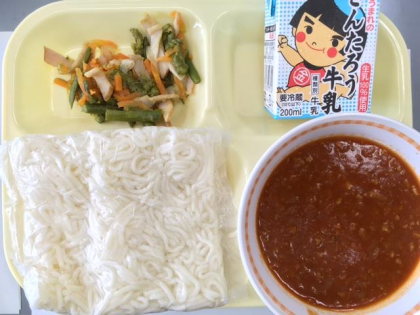 今日のメニューは、アスパラのソテー、ミートソース、ソフト麺、牛乳です。