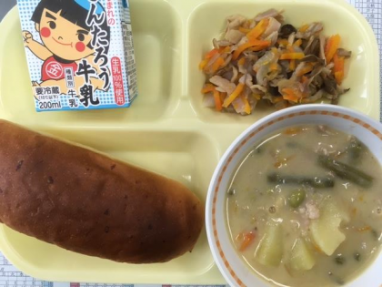 今日のメニューは、きのこのソテー、大豆とアスパラのシチュー、玄米パン、牛乳です。