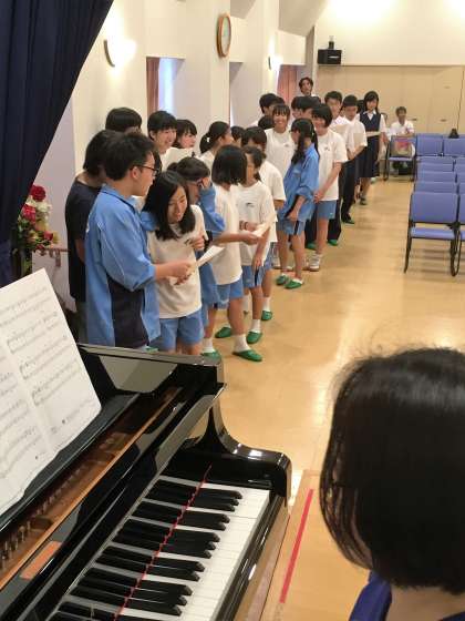 美術班も科学班も長い準備期間と入念な練習を行い今日に臨みました。写真(上・中)は、準備中の生徒の様子です。写真(下)は、PTA会長の益田さんのピアノ伴奏で、“上を向いて歩こう ”を歌う練習をしているところです。
