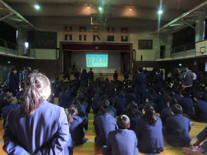 全校朝会に引き続いての生徒集会でしたが、生徒たちは、寒い中よく聞いていました。