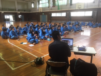 職員室の廊下に出ると、体育館から音楽が聞こえてきたので行ってみると、ちょうど男子のチームが発表しているところでした。女子の発表の写真も撮ろうと思い、少し経ってから再び見に行くと、また男子だったので写真は諦めましたが、最後のチームの発表だったのでとても盛り上がっていました。