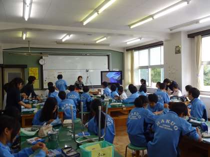 今日も家庭科の授業にスクールボランティアの皆さんがお手伝いに来てくださっています。2校時目は1年生の被服の授業。4校時目は2年生の調理実習です。今日のメニューはムニエルと粉ふきいも。じゃがいもの皮むきで、包丁を持つ手がなんだか危なげでしたが、おいしい料理に仕上がったでしょう。