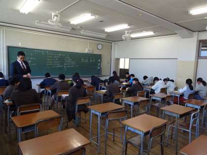 新入生対象の説明会が開かれました。吹奏楽部による、お迎えの演奏で始まりました。生徒会本部役員が映像で中学校生活を紹介した後、教科別に体験授業に臨みました。