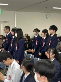 今日は5組と1年生の登校日です。真新しくて、ちょっと大きめの制服を着て、3回目の中学校への登校です。間隔を開けて並んでいる間に、提出準備をしています。そして受付で、養護の先生による健康チェックを受けてから入場します。まだまだ中学校には全く慣れていないので、堅い表情でとても緊張していますが、先生方に一声かけられると、表情が柔らかくなって、少し笑顔も見られました。