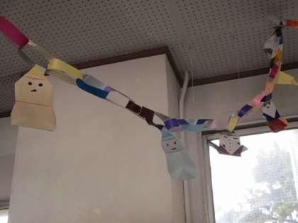 北校舎の2階廊下が、とってもにぎやかです。5組のみんなが、授業で作成した切り絵が飾られています。季節感があって、とても素敵です。