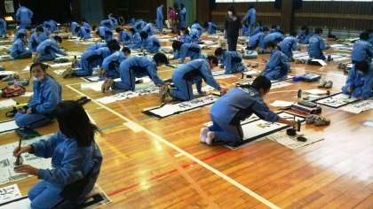 毛筆で文字を書くと自然に心が落ち着くのは不思議です。やはり集中して何かをやるのは大事です。墨の匂いも関係しているのかもしれません。寒い体育館の中で一生懸命「不言実行」を書いている1年生の姿でした。
