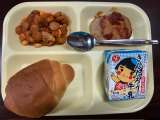 本日のメニューは、牛乳、ロールパン、ハンバーグ、チリコンカンです。パンにハンバー...