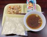 本日の給食は牛乳、かき卵風うどん、高野豆腐とちくわの煮物です。 かき卵の卵は見つ...