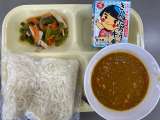 本日のメニューは、牛乳、ソフト麺カレーソース、アスパラのソテーです。ソフト麺、カ...