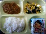 6月25日(水)今日の給食は、ドライカレー、コーンと青菜のソテー、ご飯、牛乳で...