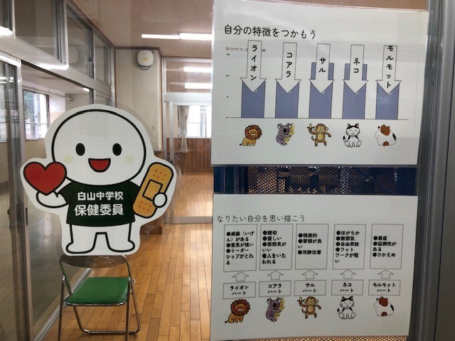 生徒総会の映像発信会場へ向かうと、本校1階のラーニングルーム前のベンチスペースには、先日の学校保健委員会で生徒の皆さんに紹介されたエゴグラムがきれいに掲示されていました。生徒の皆さんにとって、自分のことを見つめる機会になれば良いなと思っています。