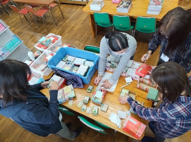 1月に開催される百人一首大会と事前練習のために、図書ボランティアさんを中心に、百人一首を整える作業を進めていただいています。