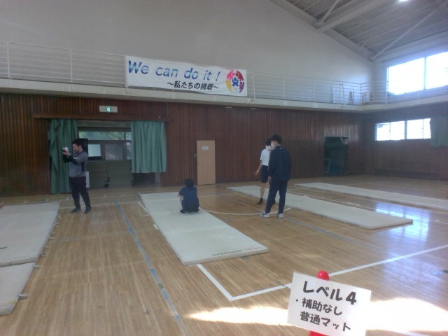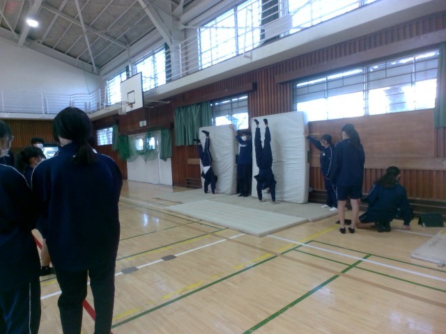 保健体育科では、倒立前転を「壁倒立」から「補助なしで倒立前転を行う」とスモールステップで場所を分けて行うことで少しずつできるように工夫して行っていました。