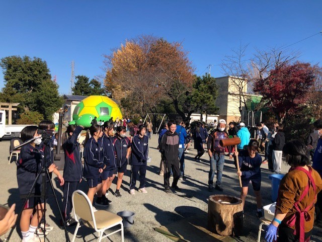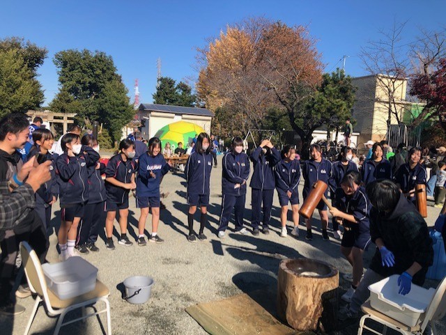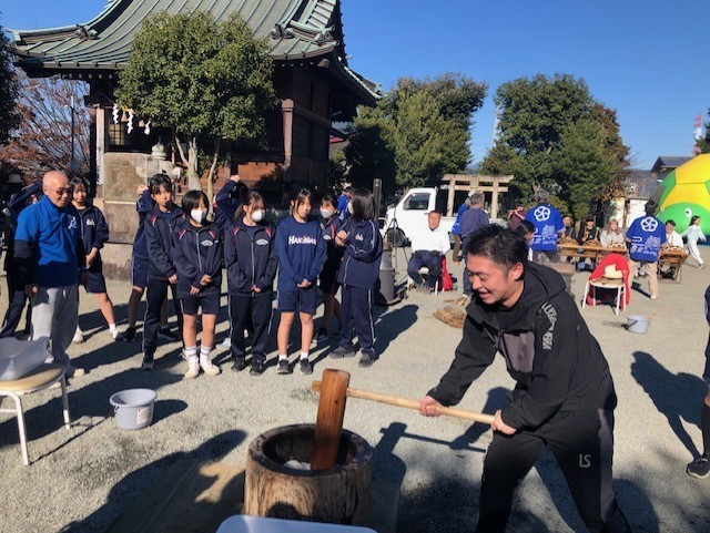 12月7日(日)に白山神社境内において、多古公民館主催の「もちつき大会」が開かれました。本校にもお声掛けいただき、部活動等の都合を確認しながら女子バレーボール部を中心に参加させていただきました。なかなかお餅を「うす」と「きね」でつくという経験は貴重なものだと思います。自治会の皆様に助けていただきながら、元気にもちつき体験ができました。