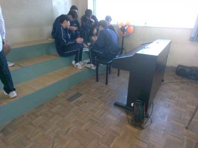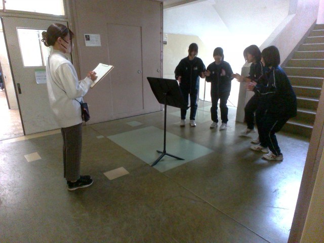 音楽の授業では、「ボディー パーカッション」を行っています。グループに分かれて、体を使って音を表現します。