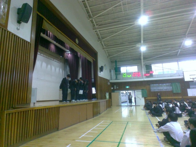 今年も今日で最後になりました。そこで、全校集会が行われました。まず、部活動や教科等での作品の表彰がありました。