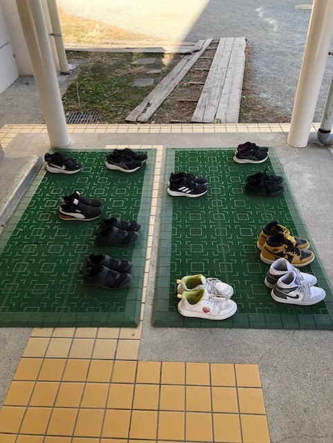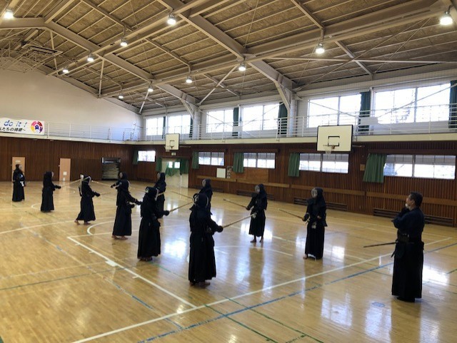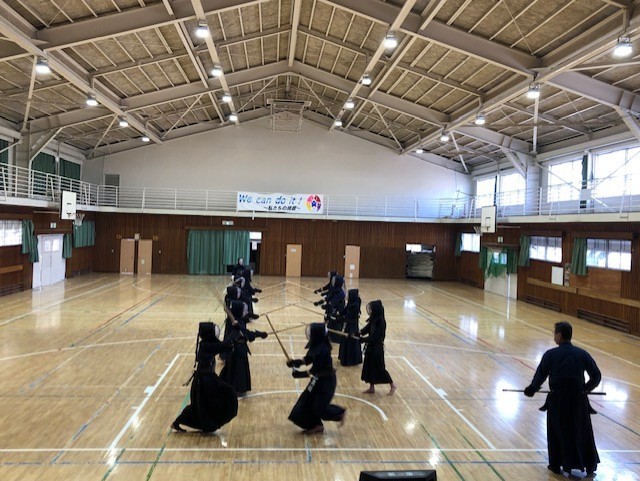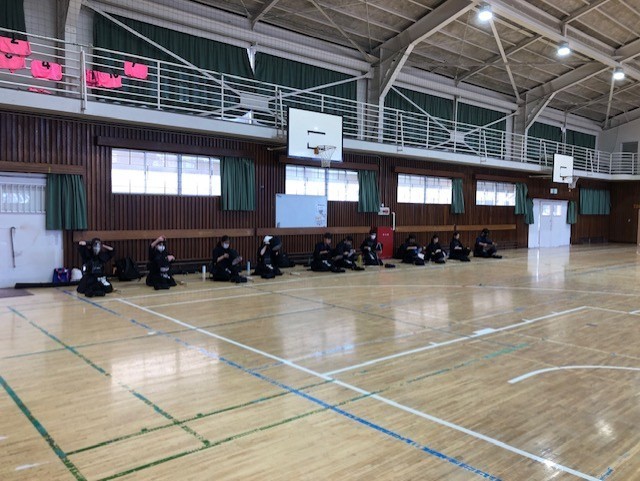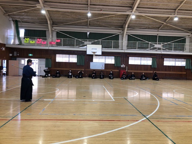 体育館では、剣道部が防具をつけて練習を行っていました。冬の時期の裸足での稽古は、体育館のフロアーの冷たさがこたえると思います。荷物や履物を丁寧にそろえ、皆で心を整えて練習に励んでいる姿が印象的でした。