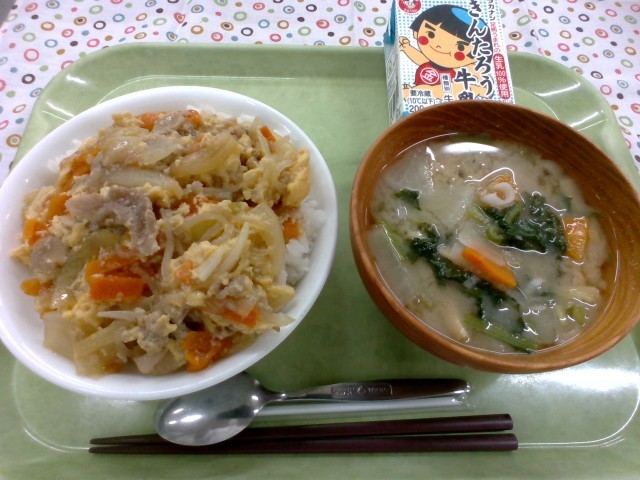 今日の給食は、「親子丼」です。 給食では、大きな回転釜を使って、だしと調味料で鶏肉や野菜を煮込みます。 その後、全体に少しとろみをつけてから、溶き卵を流し入れて仕上げます。