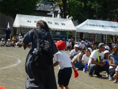なかよし班種目は今年一新しました。一つ目は「ともだちハンティング」です。白い服を着ている人、早川小学校の卒業生などのお題にあう人を探してきます。多くの保護者や地域の方が協力してくださいました。早川小学校では子どもたちと地域の大人の顔の見える関係づくりを進めています。とてもいい競技だなと思いました。