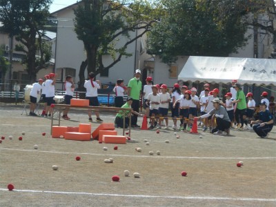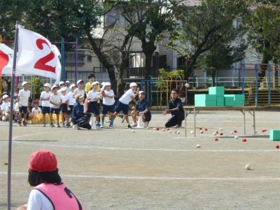 なかよし班種目2つ目は、「みかねこアタック」です。机に置かれた段ボールめがけてボールを投げて落とします。すべて落とせたら、みんなで「みゃー」となきます。よく狙って投げるのですがなかなか当たりません。みんなが楽しめる競技でした。