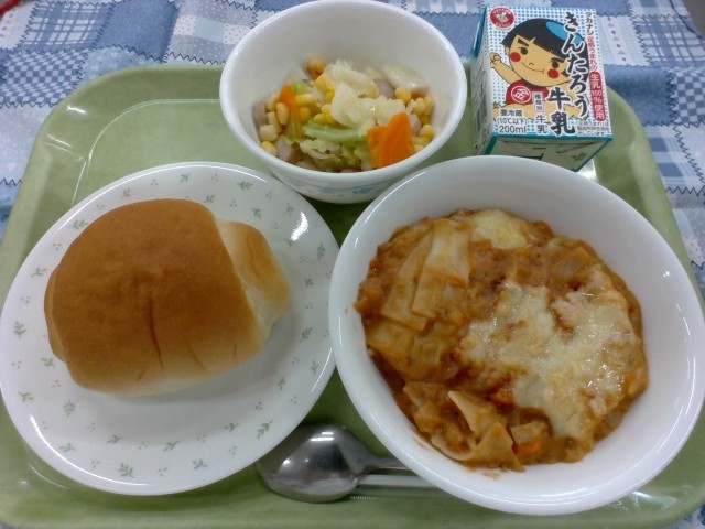 今日の給食は、ラザニア風の洋食メニューです。