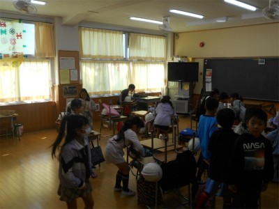 不審者の校内侵入を想定した防犯訓練を実施しました。校内の戸締りは徹底していますが、授業中に不審者が入り込んだ際の対応や情報伝達、児童の安全確保について確認しました。不審者侵入の際には極力子どもから遠ざけるよう対応します。その過程で情報を共有し全校に周知を図ります。教室では内側から鍵をかけ、机といすでバリケードを作ります。警察と連携を図りながら児童の安全は守りますが、職員も的確な行動をとるためのいい訓練になりました。日ごろの予防を徹底していきます。