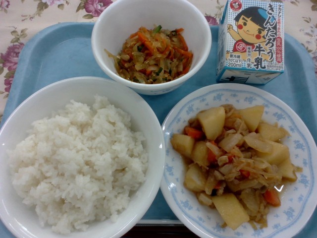 今日の給食は、肉じゃがの鶏バージョン「鶏じゃが」です。