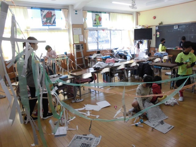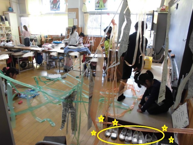 「先生。来て!来て!」と誘われて2年生の教室をのぞいてみると、教室がすごいことになっていました!!グループごとに新聞紙やスズランテープなどを使って自由に発想を形にしていく学習です。友達と相談・協力しながら体全体を使って作業している2年生の教室は、とてもいい雰囲気でした。そして、感心したのが写真2枚目の上履きです。ほら、きれいにそろっているでしょう。さすがはやかわっ子!!