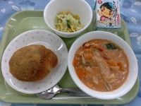 給食週間2日目の今日は「セレクト給食」です。児童は事前に注文した揚げ物3種類の中から、自分の好きなおかずを選んで食べます。写真は、コロッケ・メンチカツ・まぐろカツです。子どもたちは楽しそうに、自分の選んだおかずを味わっていました。