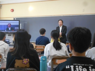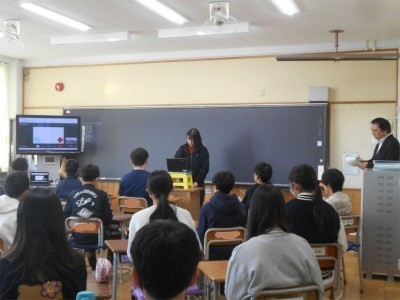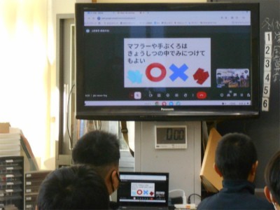 朝の時間に冬休み明け朝会を6年生の教室からリモートで行いまいした。児童指導担当からはマフラーや手袋などの防寒具の扱いやトイレの使い方、友だちとの距離についての話がありました。人によって安心できる距離はちがうので、トラブルになることがありました。時と場合にもよりますが、腕1本分くらいの距離をとることでみんなが安心できるということを教わりました。