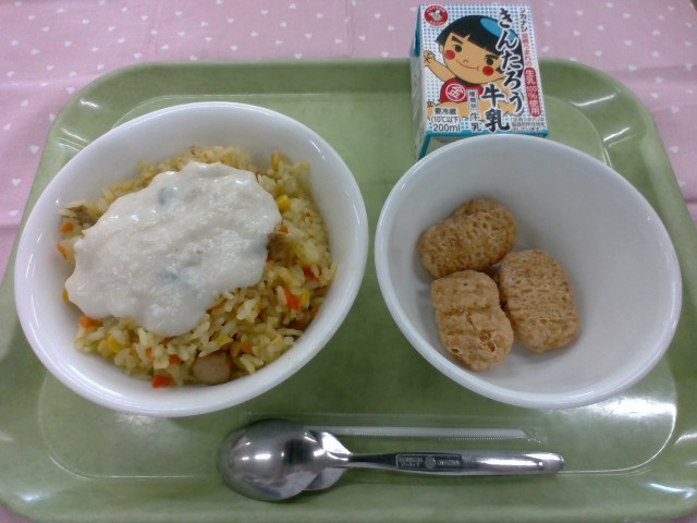 牛乳 カレーピラフ ホワイトソース添え チキンナゲット