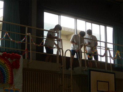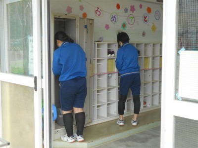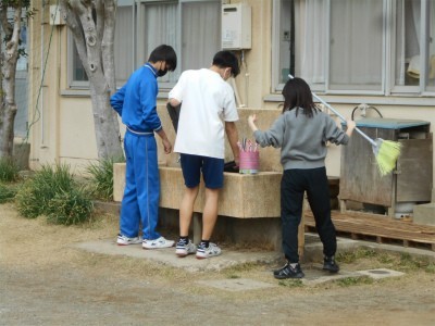 4グループに分かれ体育小屋の清掃、体育館の清掃、各教室の扇風機やエアコンフィルターの清掃、昇降口や流しの清掃を行ってくれました。みんなとても礼儀正しく感じのよい生徒さんでした。休み時間には子どもたちともかかわってくれました。運動場で1年生に長縄の連続跳びを教える様子を見てほのぼのしました。卒業を控えた貴重な時間をありがとうございました。