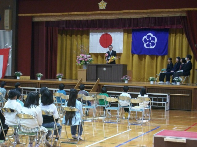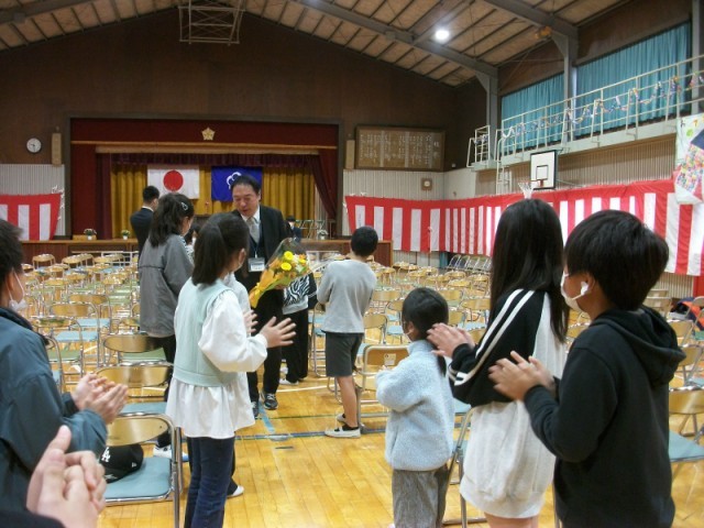 離退任式では、5名の職員が壇上に上がり、子どもたちに別れを告げました。お別れの言葉を一生懸命話す姿を見ていると目頭が熱くなりました。春は別れと出会いの季節です。4月に一つ上の学年に進級した子どもたちと会うのを全職員楽しみにしています。