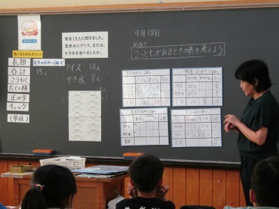 4年生は、アンケート調査の結果を2元の表にまとめる学習でした。前の時間に分かったことを伝え合うことから授業は始まりました。アイスとかき氷、両方食べた人やどちらも食べていない人がわかる表に表す方法をグループで考えました。前の時間に学習した表そのままではうまくいきません。ホワイトボードを使って考えを出し合います。
