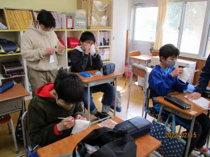教室で何かを縫っているのでしょうか。手に持っているのは、白い布? 白いゴムを頭に巻いている人もいますね。どこかで見たような布とゴム……?