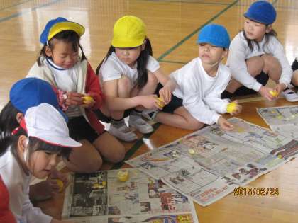 子どもたちの様子です。体育館で、みんなでまるくなって座っていただきました。楽しそうな様子が伝わってきますね。