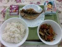 【今日の献立】 鯖(さば)の竜田揚 新ジャガのみそ汁 麦ご飯 牛乳