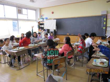 レーズンシュガーロール ブロッコリーのシチュー 牛乳・・・今日は、「ありがとうさようなら週間」の取り組みの一環として、なかよし班給食がありました。全校の児童が、なかよし班毎に集まり、一緒に給食をいただきます。1年も終わりに近付いて、なかよし班にもすっかりなれた子どもたちは、いつもと違う顔ぶれの中で、楽しそうに給食を食べていました。