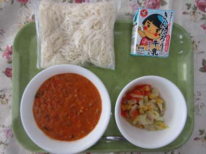 今日の献立に使われている「大豆ミート」に関するクイズが、お昼の放送で出されました。大豆ミートの栄養素は、あか・き・みどりのどのグループでしょうか?