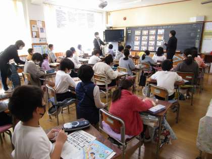 4年生の外国語です。「(学校の中で)好きな場所はどこですか?」と相手にインタビューする活動です。英語専科の先生と担任の先生が、前で見本をやっています。