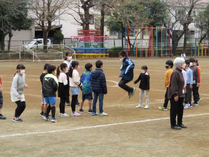 3年生と4年生が大縄跳びの練習をしていました。跳ぶリズムに慣れてくると、テンポよくピョンと飛び越えられますが、慣れるまでには練習を重ねるのがコツですね。
