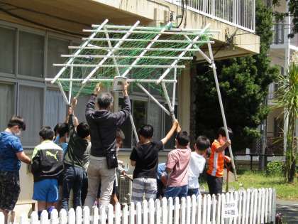 4年生も学年園に作業にきています。ヘチマやヒョウタンの支柱にネットを張っています。