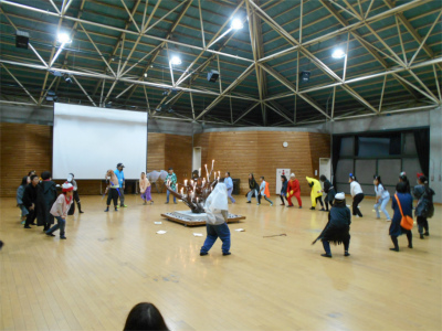 学校を離れての活動でしたが、子どもたちは本当に楽しそうに活動していました。1日目は、東京ドーム1.5個分のふれあいの村の中をグループで歩きながら目的の場所を探す写真オリエンテーリングを行いました。どのグループもチームワークよく取り組んでいました。炊事の前には火おこしを体験しました。ボランティアの方にサポートしてもらいながら、木とロープ、麻ひもなどを使って火をおこします。息を合わせてひもを引いたり、軸が動かないように押さえたりするのが大変そうでした。最後のグループに火がつくと、みんな自分事のように喜んでいました。クラスが一つになった瞬間でした。その火を使って夕食づくりです。野外炊事ではカレーライスを作りました。自分たちで作ったカレーは格別の味だったようです。子どもたちが素晴らしかったのは、自分ができることを考えて片付けまでしっかりとやり遂げたことです。ここでもチームワークの良さを感じました。夕飯の後はキャンドルファイヤーで楽しみました。ハロウィーンの時期ということもあり、子どもたちが仮装をして登場する場面もありました。楽しい時間を過ごしました。