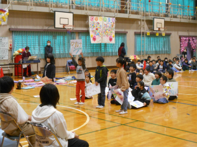 1年生からの出し物は、歌に合わせて6年生一人一人の好きなことやいいところを伝えました。「本当にありがとう、本当にありがとう」というところで目頭が熱くなりました。歌の後は、生活科で学習した昔遊びのカンポックリで競争しました。1年生の出し物を見る6年生の顔がとても優しそうでした。