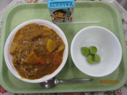 ポークカレーライス(むぎごはん) そらまめ 牛乳・・・今日の給食には、そらまめが出ました。これは、今日、2年生が皮をむいてくれたものです。そらまめは、空に向かってさやがなるので空豆というのだそうです。