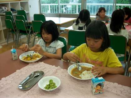 今日は、2年生がランチルームでした。自分たちで皮をむいたそらまめを「おいしい。」と味わって食べていました。